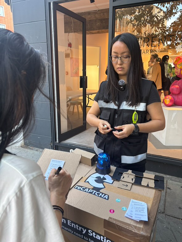 Inspired by reCAPTCHA technology, Human Proved invites visitors to “prove” their humanity through a process of reCAPTCHA in the physical world. Guests are asked to complete a short form featuring some quirky, personal questions—such as “How do you squeeze a toothpaste tube?” or “What’s the last question you asked ChatGPT?” They are then issued a “Human Proved” or “Robot Proved” sticker to wear inside the gallery.